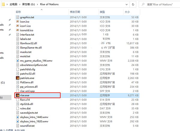 2、打开游戏文件夹,找到“rise.exe”游戏快捷方式双击进入游戏;