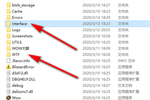 2、找到Interface文件夹和WTF文件夹,这两个里面存放都是魔兽的插件;