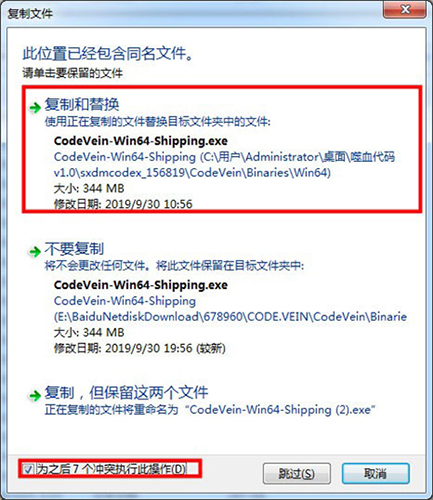 3、选择复制和替换原文件,且在左下角打勾;