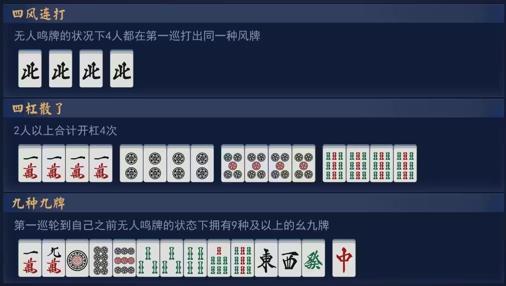 其中,万筒条分别有1-9九种各四张牌,风牌有东、南、西、北四种各四张牌,三元牌有(红)中、发(财)、白(板)三种各四张牌。