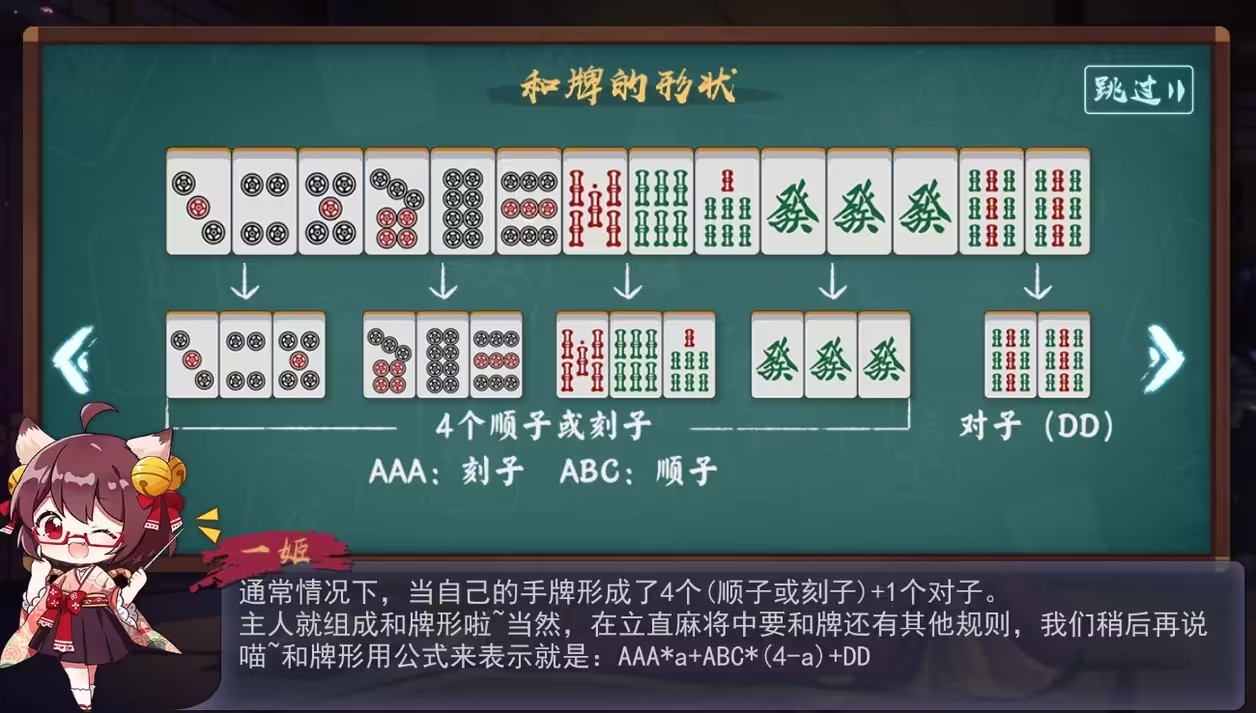顺:手中的牌由三张连续数字的同花色牌组成,如123万(筒、条)、234万(筒、条)等。如果手中有两张牌,上家打出可以与这两张组成顺的牌时,且场上没有其他人碰、杠、胡,则你可以吃牌,并将这张牌与你其余两张牌组成顺,作为副露。