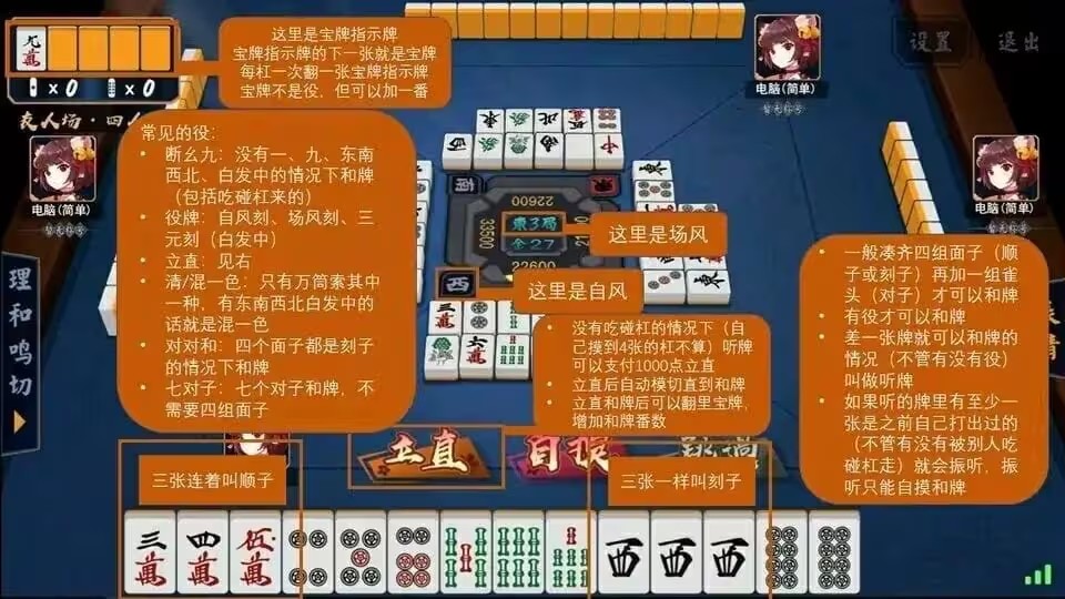 2、简单的役就是断幺九,没一万九万,没幺鸡九条,没一筒九筒,也没字牌(东西南北风白发中)。靠剩下的牌凑起来。